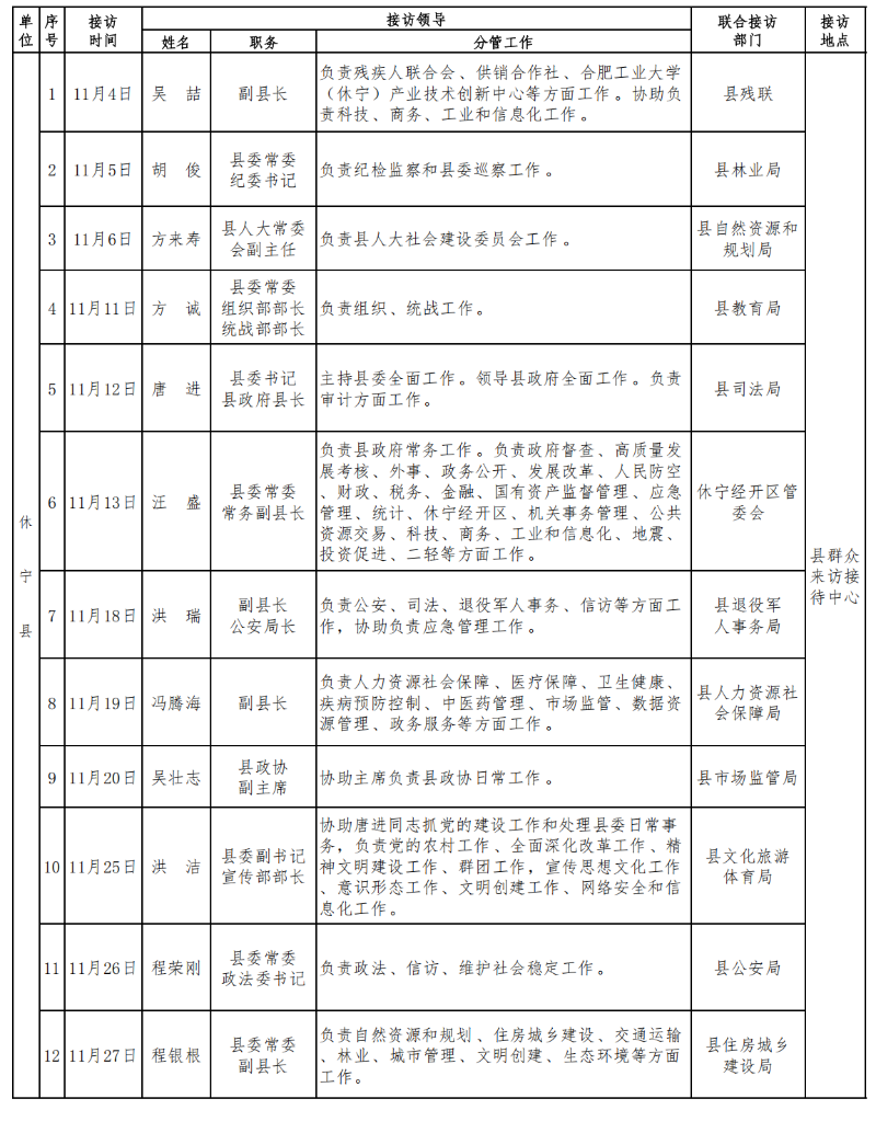 2025年11月份休宁县党政领导干部接访情况安排表