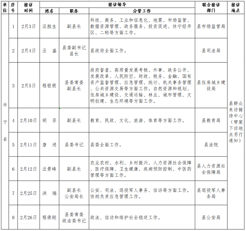 注:接访事项原则上为初访事项,已经县级及以上领导多次接待或事权处理机关已经出具明确处理意见的重复访事项,原则上不再接待。如有新诉求需提前预约登记,预约号码:0559-7512248。