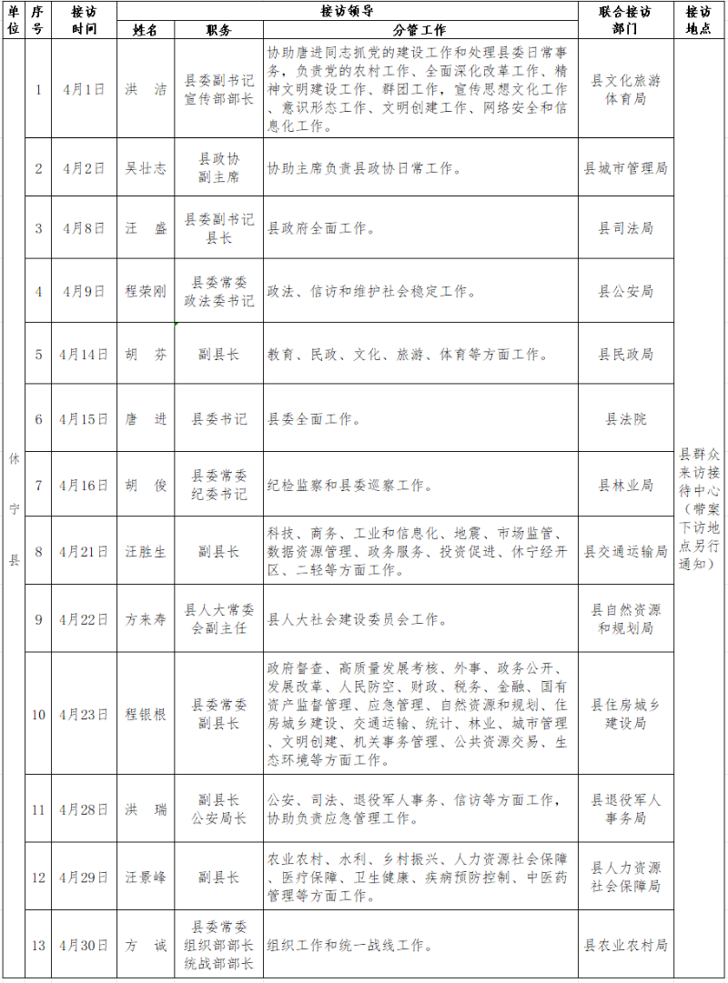 2026年4月份休宁县党政领导干部接访情况安排表