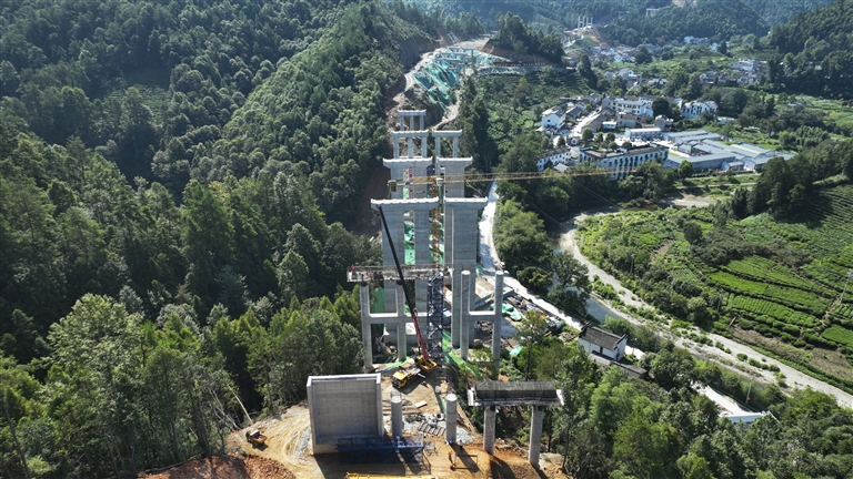 8月23日,休宁县汪村镇境内,德上高速皖赣界段项目02标段汪村互通、汪村特大桥等施工点“拔节生长”,千余名工人、数百台套机械设备全速推进工程建设,力争明年底建成通车。