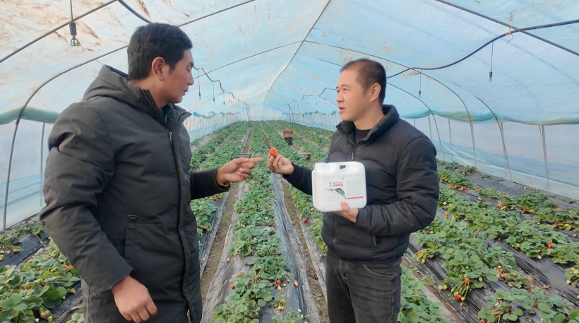 草莓雪桃种植户霍江涛说道:“自从用了鱼蛋白肥料,草莓的叶子生长得比以前肥厚,颜色更加翠绿,草莓的口感也得到了提升。除了草莓,西瓜、香瓜等口感也特别好。通过使用这款肥料,产量、收益都有所增加。”
