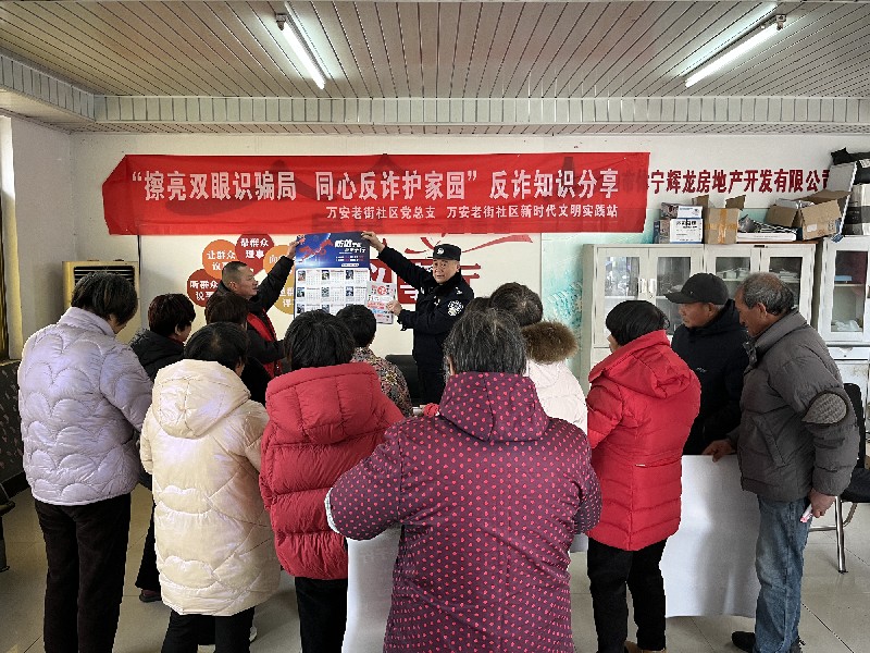 临近新春佳节,为筑牢社区安全防线、弘扬文明新风,万安镇万安老街社区在徽风园小区开展 “擦亮双眼识骗局 同心反诈护家园” 反诈知识案例分享会,邀请辖区派出所警官现场授课,同步开展抵制高额彩礼宣传活动,为居民送上 “平安+文明” 双重保障。