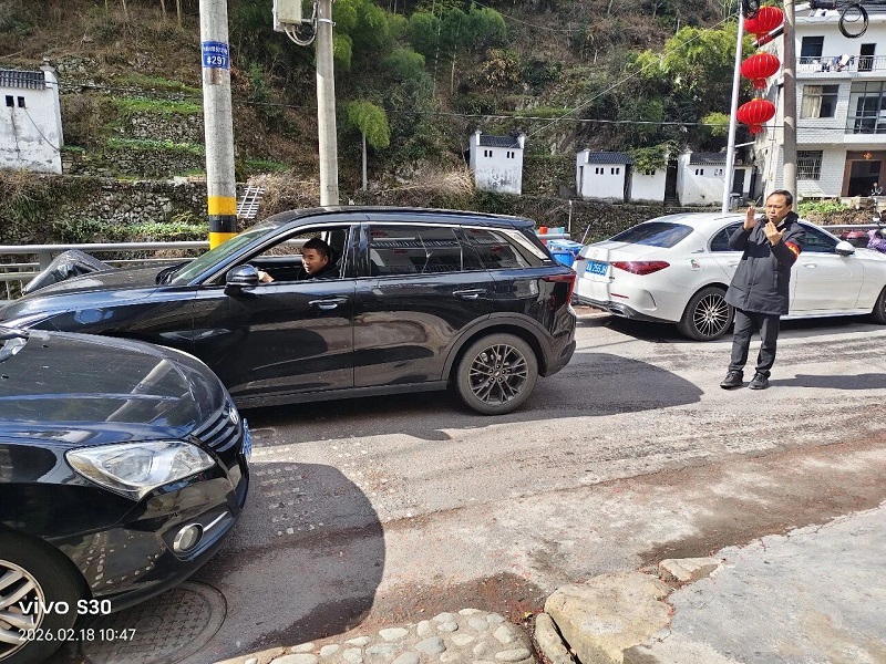 璜尖乡地处深山,省道璜尖岭盘山公路以弯多、坡陡、路窄著称,皖浙1号线——“徽州天路”穿境而过。春节期间,随着在外务工人员集中返乡以及慕名而来的自驾游客增多,这条承载着乡亲们出行希望的“主动脉”,也迎来了巨大的通行压力 。
