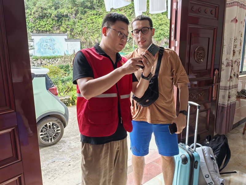 意大利游客抵达后,白际乡志愿服务点工作人员立即接应。考虑到境外游客的登记需求,志愿者耐心引导大家出示护照,逐项核对姓名、签证有效期、入境口岸等信息,细致录入住宿登记系统。核对间隙,还同步讲述白际乡的山水故事,让高效的服务中多了份温情。咨询路线时,志愿者结合留学生的行程与偏好,精准推荐了严池高山古村落、人民公社、百丈冲瀑布等必打卡点;又顺着他们对当地文化的兴趣,深入讲解白际人民公社旧址的历史,让大家在赏景时读懂乡村的厚重底蕴。此外,志愿者还热情介绍了红薯干、高山茶等特色农产品,民宿经营者也贴心安排了农家美食体验。留学生们纷纷表示,白际的原生态风光与暖心服务让人难忘,一定会把这个 “云端上的秘境” 分享给更多欧洲朋友。