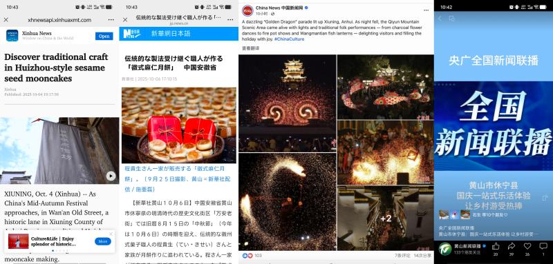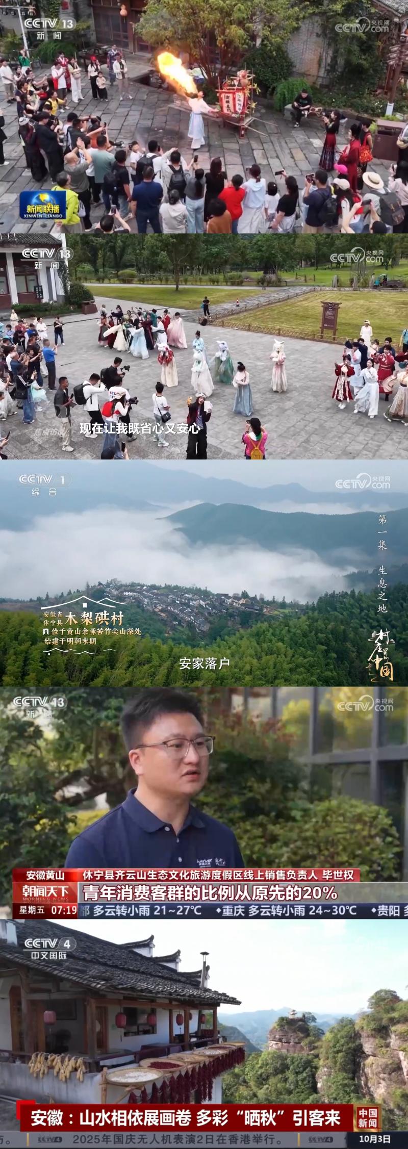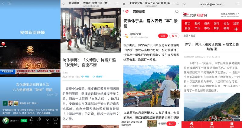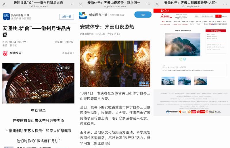 精心策划假期外宣宣传,积极主动对接央媒省媒,精准报送选题素材,争取更多报道版面、画面。央视新闻联播《多项举措激活国庆中秋假期消费活力》刊播了齐云逍遥街文旅焕新场景;综合频道焦点访谈栏目播出《假日经济 蓬勃活力》、中文国际频道播出《安徽:山水相依展画卷 多彩“晒秋”引客来》、新闻频道和财经频道播出《“信用游”解锁假期文旅服务“新姿势”》,展示了文旅消费市场新方式和秋日晒秋美景。央视纪录片《村庄里的中国》播出第1集《生息之地》展示中国传统村落——木梨硔美景,揭秘千米悬崖边的天空之城。深度挖掘我县中秋习俗,对接策划选题,中秋舞香龙、徽式月饼等获新华社、中新社、人民网等多平台宣传,其中新华社客户端刊发《天涯共此“食”——徽州月饼品古香》,浏览量达160.2万次,并获海外媒体推介。新华网推出《国庆假期首日齐云山度假区接待人次创新高》,中央人民广播电台、人民网、央广网、中新网、国际在线、安徽日报、安徽新闻联播、香港商报、中安在线、大皖新闻、凤凰网安徽、安徽经济网等持续推出系列假日动态报道。