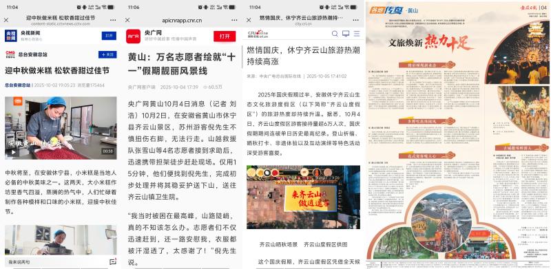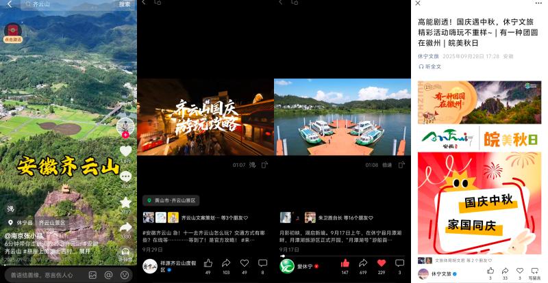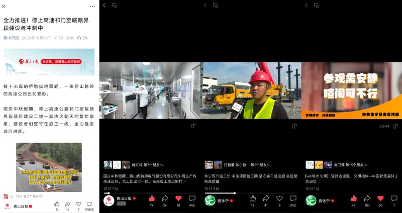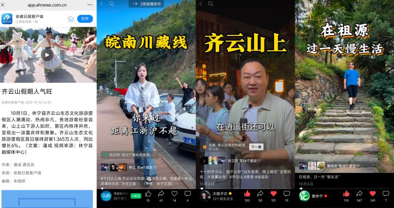 坚持大屏与小屏联动宣推,紧盯假日文旅市场动态,聚焦优质文旅资源、特色消费场景、多元文旅业态,推出适应新媒体平台传播的短视频产品。围绕齐云逍遥街焕新业态、齐云山晒秋新场景、黄村“国庆一站式乐活体验”活动、祖源文旅新业态、蓝田三棵树景区、中秋舞香龙等,推出短视频作品43部,还与本地自媒体达人开展联动创作,推出《在祖源,过一天慢生活》等更具传播力的新媒体产品。协调中新网安徽频道、安徽日报、浙江电视台《今日长三角》、市场星报、黄山日报、黄山广电台等省市新闻媒体所属新媒体平台及县内文旅新媒体矩阵联动发布,切实展现文旅新场景新业态的对外吸引力和文旅市场的消费新活力。持续关注假日坚守、志愿服务、文明旅游等情况,推出《德上高速双节施工忙,工人坚守筑通途》《旅途漫漫,文明相伴——中国状元县休宁欢迎您》等短视频。黄山日报记者走进我县德上高速祁门至皖赣界段建设现场、黄山奥特斯电气股份有限公司生产现场,以图文及短视频形式报道我县假日重点项目不停工、企业生产不打烊,建设者们和生产者们坚守岗位绘就假期里的“奋进图景”。