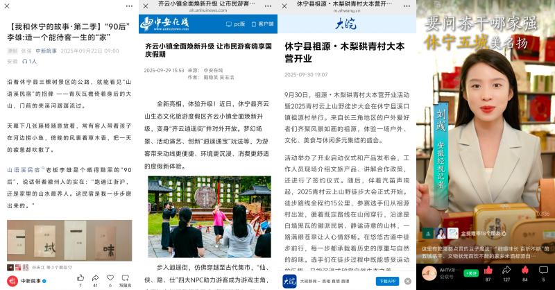 提前策划,精心组织,围绕齐云逍遥街等文旅全新场景和焕新业态,推出多形式、多平台的宣推稿件和新媒体产品。重点聚焦齐云逍遥街50项全新演绎、逍遥通宝全新玩法等进行宣传推广,组织中安在线、安徽经济报、黄山日报、黄山广电台、县融媒体中心赴齐云逍遥街采访,持续推出新玩法、新线路等新媒体图文、视频产品40多条次。联动祥源齐云山度假区,在多个自媒体平台开展营销推广,邀请南京张小品等116名自媒体达人线下打卡拍摄,平台粉丝总数达到4745.1万。同时,与中新社安徽分社联合推出《我和休宁的故事》第二季专题,先后聚焦五城、蓝田等民宿业态推出新媒体图文产品;与安徽经视联合推出《村落休宁》专题,围绕黄村文旅业态、五城米酒、五城茶干推出短视频;邀请新闻媒体记者及自媒体达人参与祖源・木梨硔青村大本营开业活动暨2025青村云上山野徒步大会宣传;月潭湖旅游区开园等活动组织自媒体人士围绕美食美景推出多部短视频作品,充分依托县内文旅新媒体开展矩阵式宣推,实现文旅业态线上“种草”,吸引游客群体线下“拔草”。