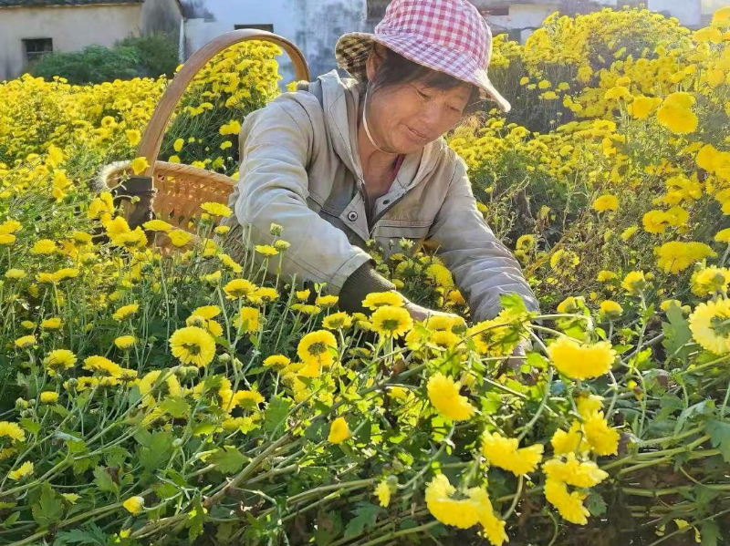 加工提价值,务工添收入。鲜菊采收后,即刻被送往村里的加工点,开启“身价倍增”的蜕变。工人们流水作业,分拣、清洗、烘干一气呵成,整个流程高效运转。“咱们加工讲究‘鲜快准’,采摘后 4 小时内必须入烘房,这样才能锁住菊花的鲜香和功效,在市场上站稳脚。”加工点负责人介绍,完善的加工环节不仅让菊花附加值大幅提升,更给村民提供了就近务工的岗位,不少人采摘之余来此上班,多了一份稳定收入。