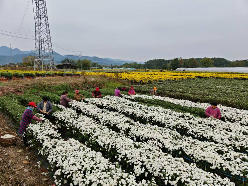 一花引领,全域芬芳。如今,菊花种植产业已从盐铺村辐射至齐云山、万安、蓝田、源芳等多个乡镇。我县依托优质乡村旅游资源,引导企业延伸产业链条,大力发展菊花深加工,不断提升产品附加值,走出一条农文旅深度融合的特色发展之路。据统计,今年全县菊花种植面积达1.81万亩,年产值突破2.3亿元。每到夏秋季节,万亩菊海白花似雪、黄花如金,既是扮靓乡村的生态风景线,更是带动菊农增收致富的“经济线”,让“美丽风景”真正转化为惠民利民的“美丽经济”。