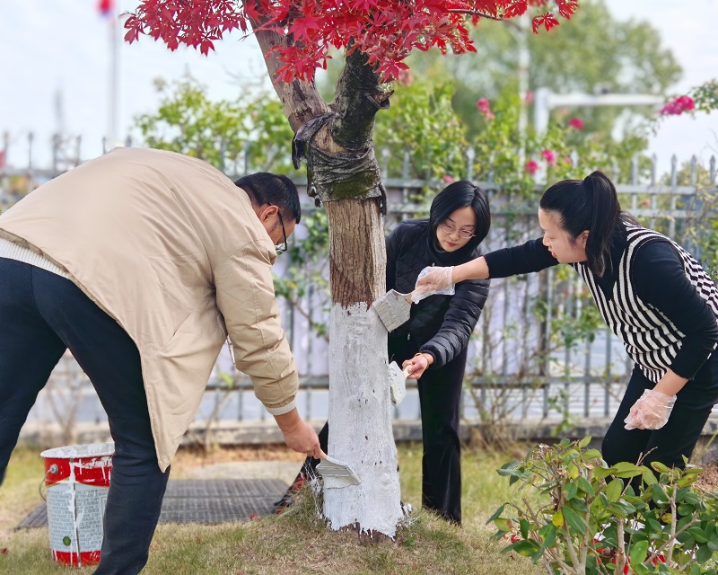 活动中,县林业窗口人员结合自身业务专长,向参与党员详细讲解了桂花树冬季养护要点,从病弱枝、过密枝、徒长枝的识别标准,到剪口倾斜角度的把控,再到生石灰防虫涂料的科学配比、涂刷高度及均匀涂抹的操作技巧,一一精心指导,确保养护工作科学规范。各位党员分工协作,热情高涨,有的手持手锯精准修剪,有的弯腰认真涂刷树干,大家不怕脏、不怕累,严格按照技术规范完成每一项操作。经过共同努力,院内树木树形更加整齐美观,树干防虫涂层均匀到位,为树木安全越冬筑牢“防护盾”。