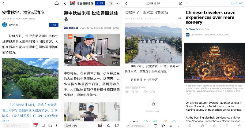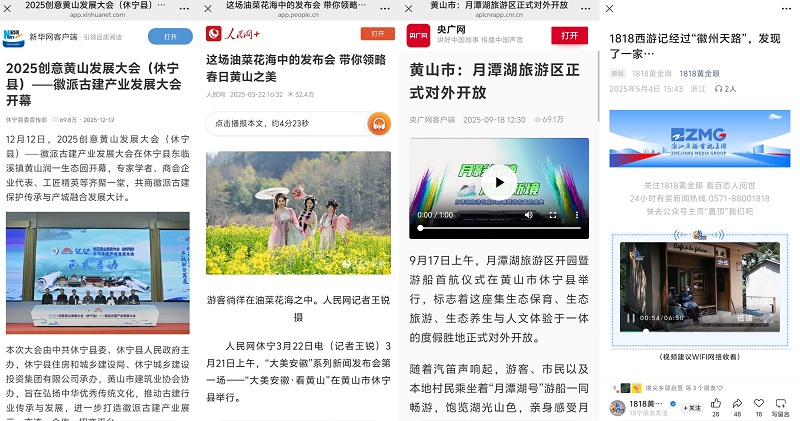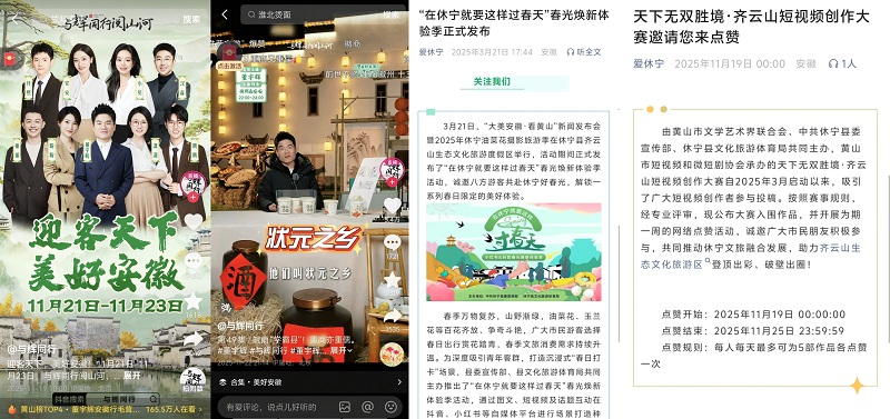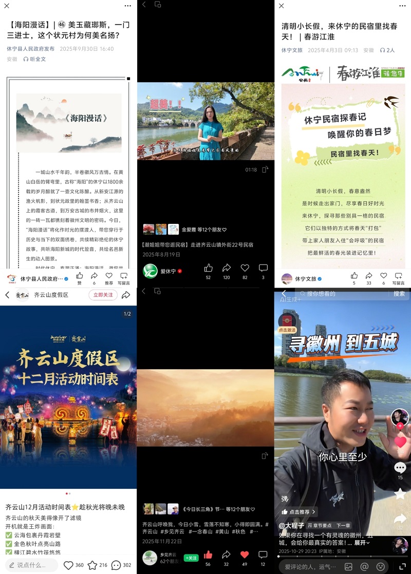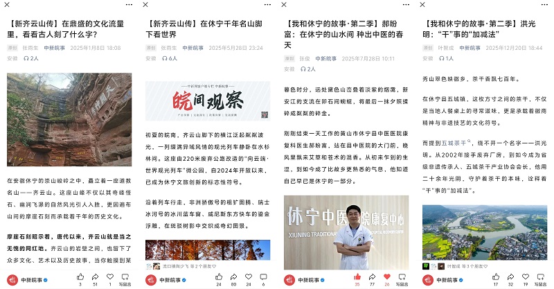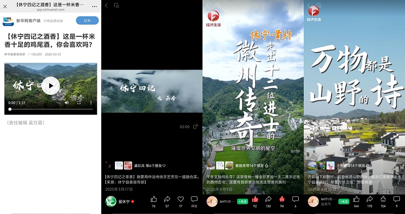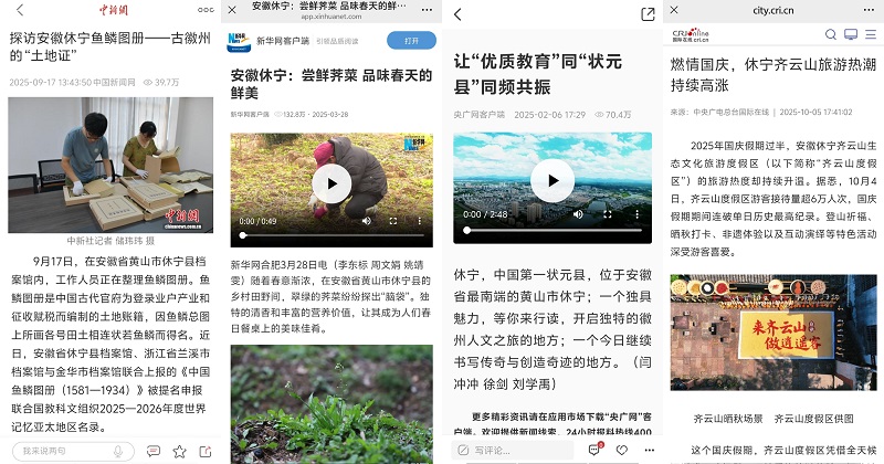 围绕特色产业、美景美食、乡村振兴,策划推出了《新齐云山传》《我和休宁的故事·第二季》《休宁四记》《村落休宁》等分领域多角度的宣传专题,让休宁故事更加动人,让“中国状元县”名片更加闪亮。《我和休宁的故事·第二季》系列推出《郝盼富:在休宁的山水间 种出中医的春天》等17期圆满收官,锚定“新休宁人”群体,打捞奋斗者与小城共生的鲜活故事;《新齐云山传》系列推出《齐云山VS黄山:两朵奇葩何以对峙?》等21期,从还原历史现场、解读地域文化、聚焦动态变化等方面阐述齐云山魅力;休宁徽菜食材推介片《休宁四记》推出《初见》《豆香》《酒香》《茶香》四集,呈现一场视觉和味觉的双重盛宴,在新华网等平台累计阅读量达337万人次。《村落休宁》系列完成岩脚村、白际村等8期,展现散落在休宁青山绿水间的美丽乡村。“爱休宁”“中新皖事”“AHTV第一时间”等多个新媒体账号持续发布,朋友圈不断转发,热度不减。