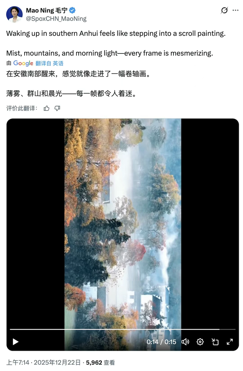 外交部发言人毛宁在海外社交平台X(原推特)账号分享休宁溪洲的绝美短视频,配文赞叹:“在安徽南部醒来,感觉就像走进了一幅卷轴画。这里的薄雾、群山和晨光——每一帧都令人着迷。”在全球网友中激起热烈反响纷纷留言互动。在多家面向境外和国际传播的新闻媒体持续发稿、对外宣推,累计发稿600余条次,不断推动休宁走向国际舞台。配合开展了“2025海外华文媒体走读安徽”活动、“打卡中国 潮涌东方——你好,安徽”网络国际传播活动等,配合参与了第十三届“徽山·徽水·徽文化”安徽省外国留学生文化修学活动、2025年东南大学-宾夕法尼亚大学国际夏校“村落徽州行”活动等,邀请海外华文媒体、国外网红博主、外国留学生走进休宁、宣传休宁,实地感受我县经济社会发展成果和文旅融合发展新业态。围绕休宁中学英语音乐剧《美女与野兽》开展宣传报道,邀请历届休中外籍教师讲述休宁教学期间的收获和感受。