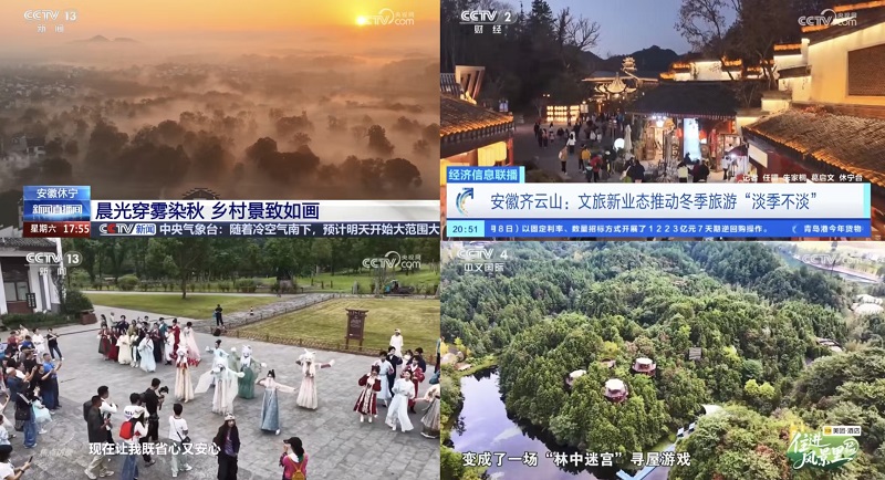 安徽省“欢欢喜喜过大年”黄山主场活动、“大美安徽·看黄山”新闻发布会暨休宁油菜花摄影旅游季活动、2025创意黄山发展大会(休宁县)——徽派古建产业发展大会……一场场文旅活动精彩纷呈。齐云山霞客古道登高赛、三国赤壁古战场杯围甲联赛状元休宁专场、安徽省桨板公开赛、全国国际跳棋校际联赛总决赛……一项项体育赛事落地休宁。齐云山持续“上新”,无人机烟花秀点亮夜空,逍遥街NPC趣味互动不断。“齐云生活居·行走徽州”旅游专列启程,月潭湖旅游区盛大开园,祖源·木梨硔青村大本营正式启幕,还有黄村长桌宴、璜尖崖边生活馆、白际瀑语咖啡……“村游”日渐火热,“村咖”遍地开花,新场景、新演艺、新玩法激发消费新活力。新华每日电讯刊发《“低空+旅游”如何激发消费新活力?》等,央视综合频道、财经频道、新闻频道等多个频道播出《“信用游”解锁假期文旅服务“新姿势”》《安徽休宁 非遗民俗火爆乡村旅游》《消费市场提质向好 助力经济高质量发展》《非遗民俗表演 打造文旅新场景》等报道。