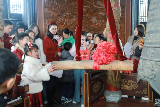 伴着清脆的诗词声,大家踏着福道向状元阁前行,途中自发诵读经典,童声与笑语相融。登上状元阁,青年学子挥舞红旗热情相迎,暖意融融。“咚……咚……”以家庭为单位,依次上前敲响状元大钟,钟声雄浑悠远,传递着阖家幸福、学有所成的新春祈愿。钟声里,全体参与者齐诵《元日》《少年中国说》《沁园春·长沙》等经典篇目,铿锵有力的诵读声与钟声交织,奏响新春奋进的乐章,也让文脉传承的种子在每个人心中悄然生根发芽。