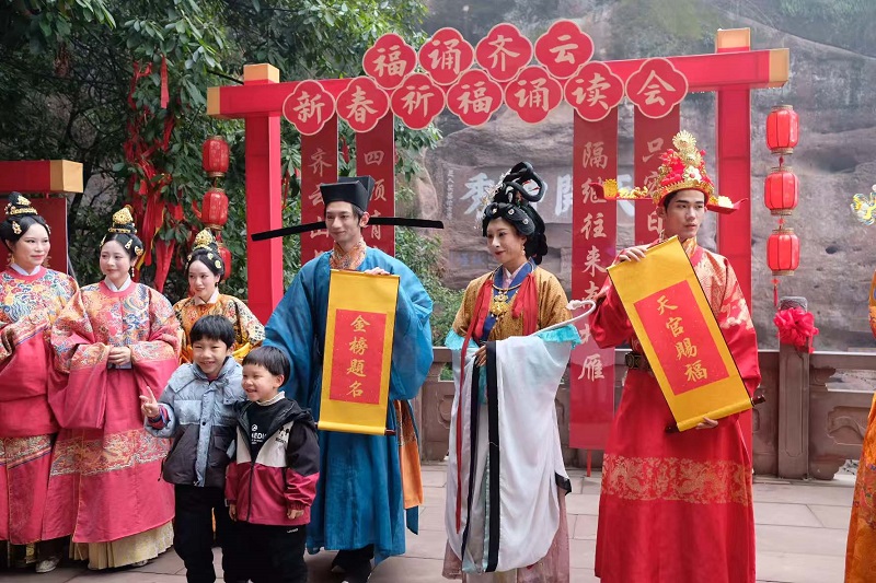 2月17日,农历新年第一天,安徽休宁齐云山景区真仙洞府广场前诗声朗朗、福意融融。“福诵齐云·新春祈福诵读会”在此举行。众多游客和亲子家庭齐聚承载千年文韵的齐云山摩崖碑刻之间,以诗为媒,在诗词诵读和游戏互动中,开启新春纳福之旅。