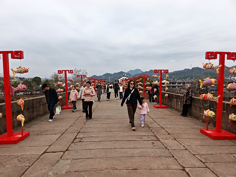 农历马年春节,齐云山生态文化旅游度假区处处洋溢着喜庆祥和的节日氛围。在度假区入口处,大型鲜红福字造型格外醒目,往来游客纷纷驻足打卡,沾取新春福气;滨江路上,数百盏龙灯整齐排列、璀璨夺目,成为一道亮眼的风景线,引得游人驻足观赏;登封桥两侧,精致的鱼灯高高悬挂,为马年新春更添几分灵动与喜庆。桥下横江碧波荡漾,一艘艘竹筏满载游客穿梭其间,尽赏山水美景;岩脚至齐云山的登山古道上,游客络绎不绝,山脚特色小吃店前,艾叶粿、米粽等本地美食备受青睐;齐云山上,“纳福、送福、守福”主题祈福活动有序开展,让游客沉浸式体验传统年俗。正午时分,“登封桥”“桥头宝”“齐镇”等上百家酒店、农家乐座无虚席,热闹非凡,处处升腾着人间烟火气。