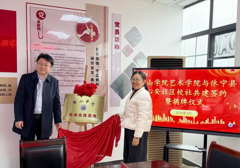 双方代表签署共建合作协议,合作内容涵盖公益艺术课堂、志愿服务实践等,将以常态化机制推动校地共建走深走实。在全体人员见证下,双方共同为黄山学院社会实践基地揭牌,标志着合作正式启动。