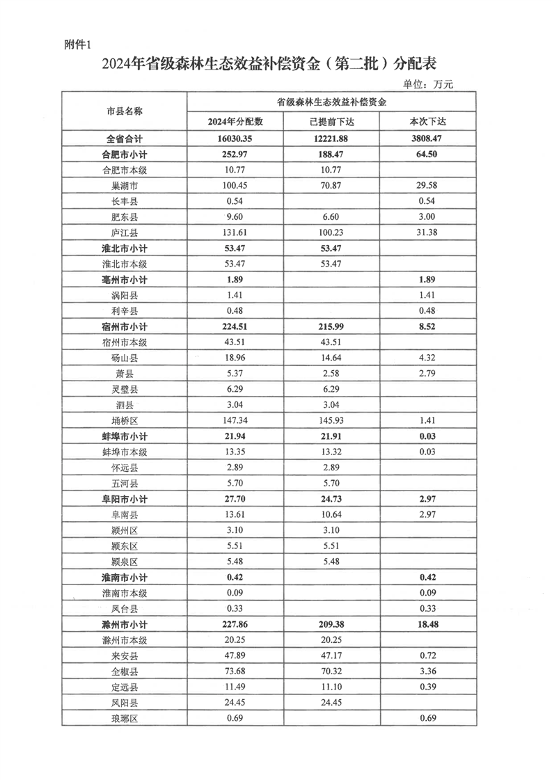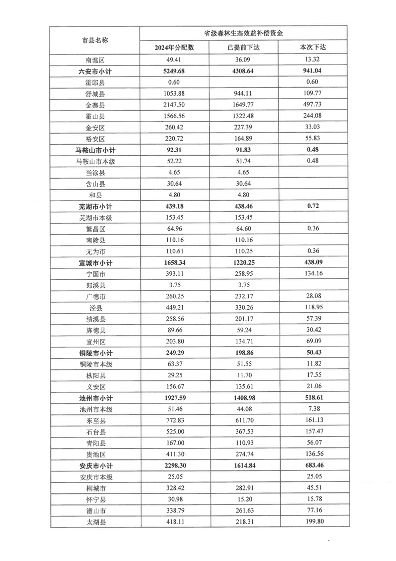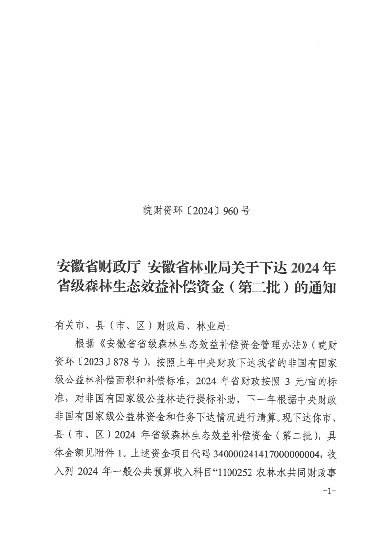 安徽省财政厅 安徽省林业局关于下达2024年省级森林生态效益补偿资金(第二批)的通知