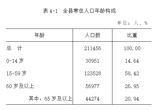 全县常住人口中,0-14岁[4]人口为30951人,占14.64%;15-59岁人口为123528人,占58.42%;60岁及以上人口为56977人,占26.95%,其中65岁及以上人口为44274人,占20.94%。与2010年第六次全国人口普查相比,0-14岁人口的比重上升1.37个百分点,15-59岁人口的比重下降11.61个百分点,60岁及以上人口的比重上升10.24个百分点,65岁及以上人口的比重上升9.94个百分点。