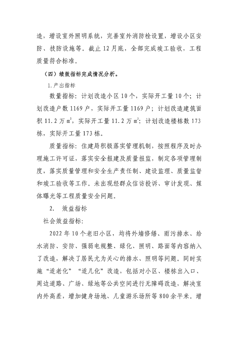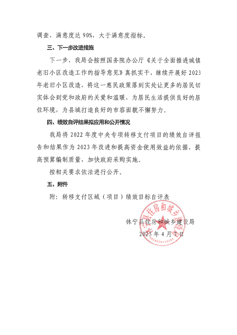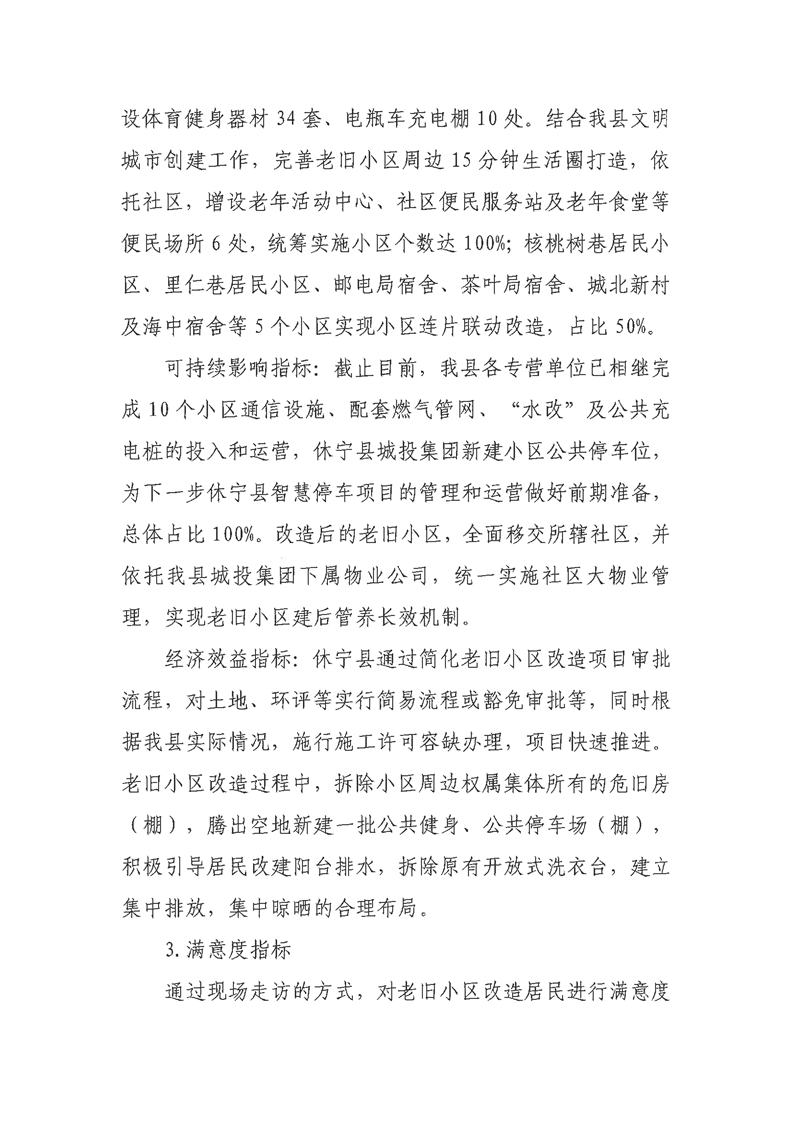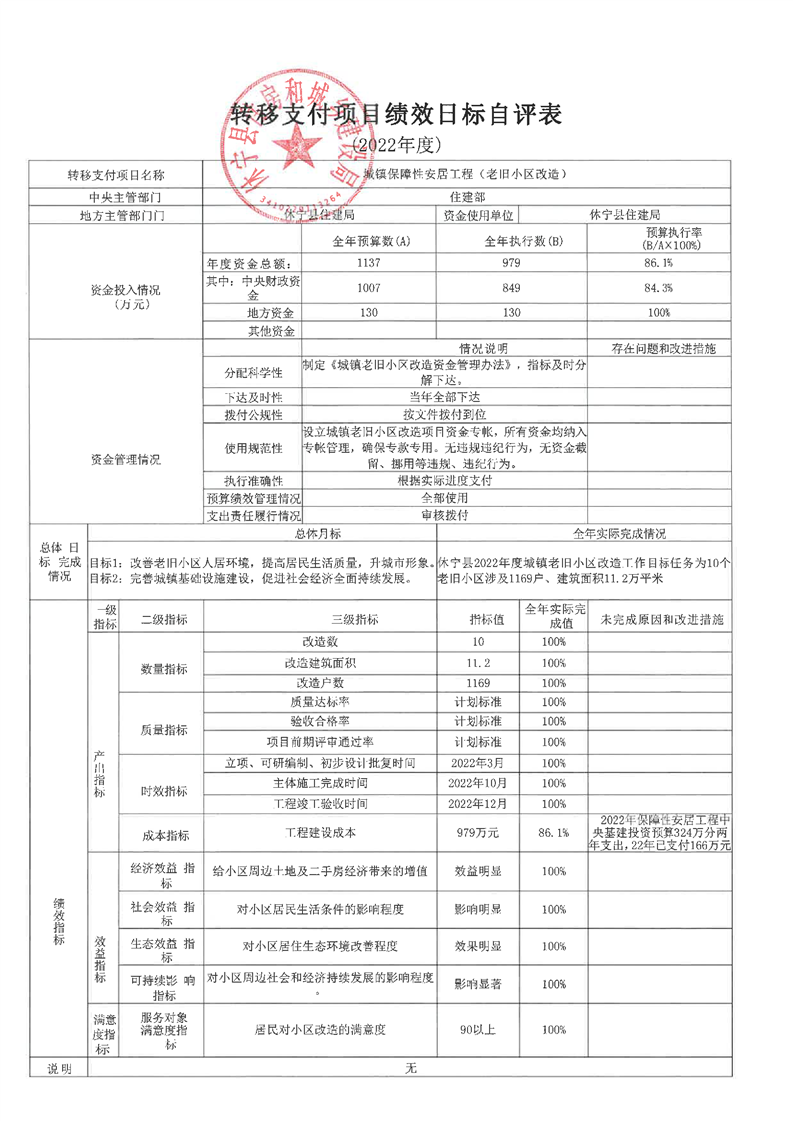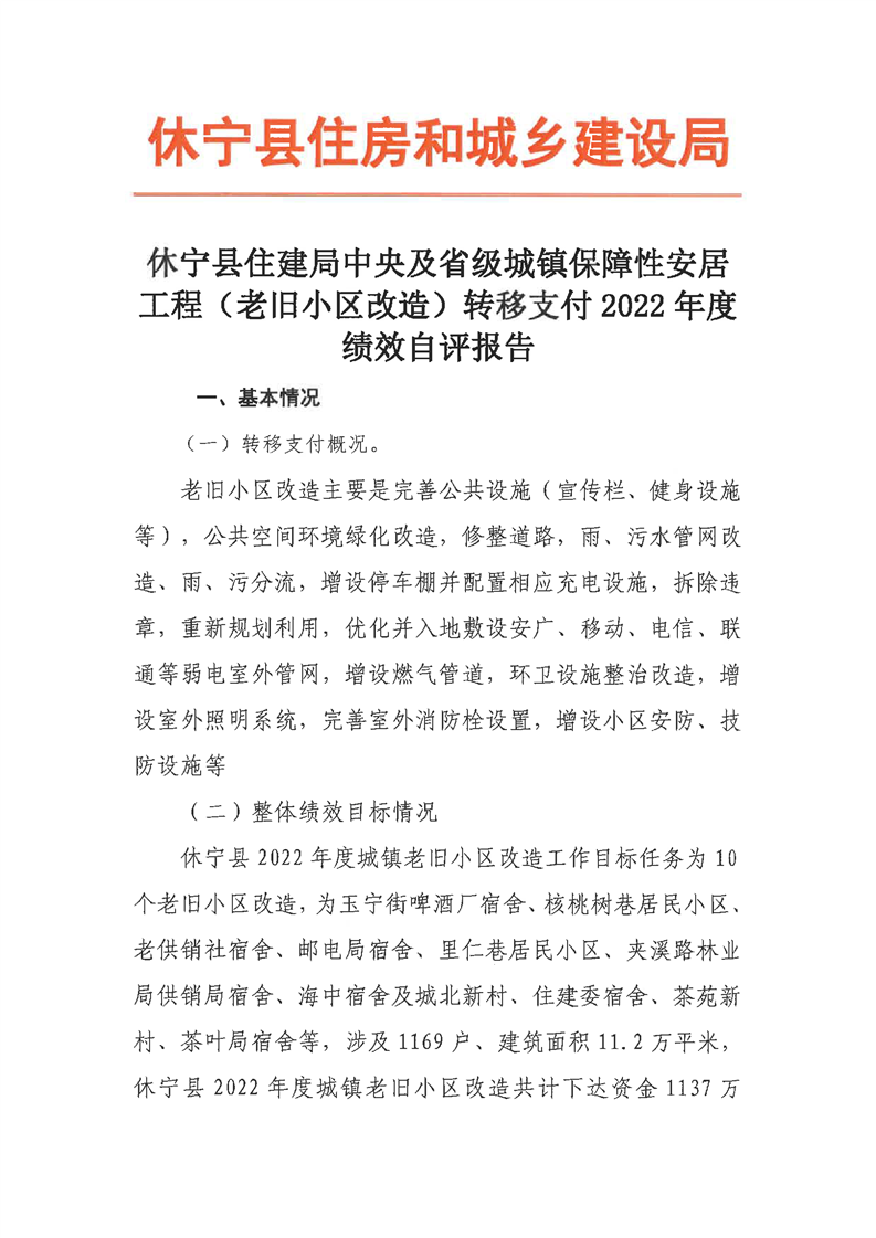 休宁县住建局中央及省级城镇保障性安居工程(老旧小区改造)转移支付2022年度绩效自评报告