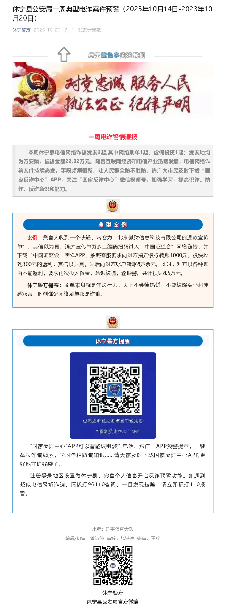 【社会治安主动回应】休宁县公安局一周典型电诈案件预警(2023.10.14-2023.10.20)