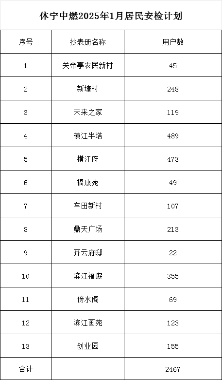休宁县2025年1月份居民安检抄表计划通知
