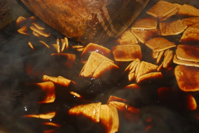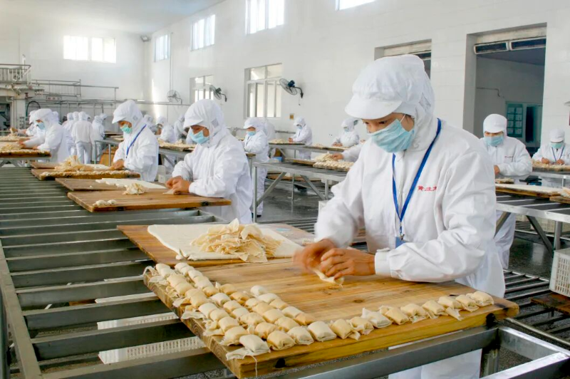 标准化生产车间做五城茶干第一道工序就是“选豆”。要选那金灿灿,颗粒饱满的本地黄豆,然后是浸豆、洗豆。黄豆要浸泡漂洗得干净,那样磨出来的豆浆就无渣质,入嘴细腻口感好。黄豆浸泡发胖后,开始上石磨磨豆浆,洁白如乳的豆浆顺着石磨磨槽缓缓流出,沿着口子汇聚到木桶中。那边开始在铁锅里烧水,准备冲豆腐浆。水一定要沸腾,热气袅袅,人在锅前,好似仙女下凡。师傅在木桶里下一定比例的盐卤或者石膏,这比例可是做豆腐的绝活,只可意会,不传外人。师傅一边小心翼翼倒着盐卤,一边用勺在木桶里不停地均匀搅拌,仿佛是神奇的力量,这豆腐花就渐渐生出了。然后上豆腐箱,一箱箱豆腐重叠起来,上榨榨豆腐,借助压力榨出水分。上榨的时间越长,豆腐干的韧性就越好,吃起来就越有嚼劲。豆腐干定型后,再倒入开水中焯一下,除去豆腐沥气息,最后把成型的豆腐干放进配上各种作料的锅里,煮几个小时。煮豆腐干的作料有讲究,主要有冰糖、大茴、陈皮、桂皮、丁香、味精和上等的酱油。最后在出锅前,在茶干上均匀地浇上一层香油,撒上一些白芝麻等。不一会,那香气扑鼻,味美质细的五城茶干就大功告成了。