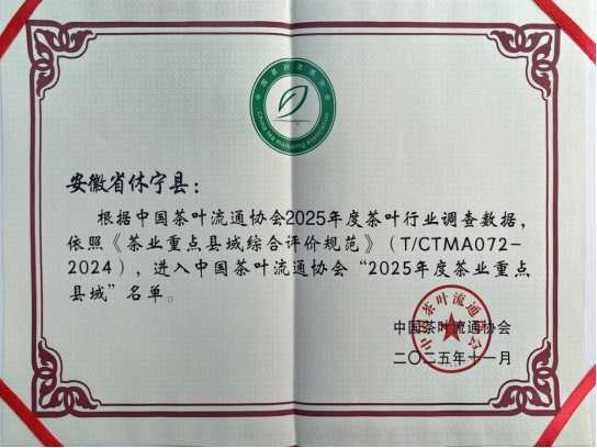 近日,我县在第二十一届中国茶业经济年会上被授予“2025年度茶业重点(原百强)县域”荣誉称号,黄山王光熙松萝茶业股份公司与黄山市新安源有机茶开发有限公司获得“2025年度茶业重点(原百强)企业”称号。