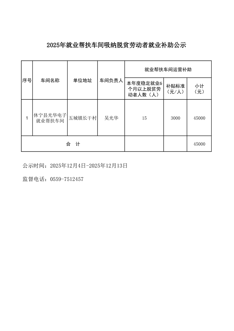 2025年就业帮扶车间吸纳脱贫劳动者就业补助公示