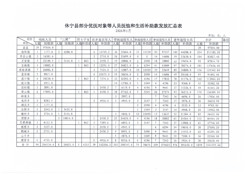 休宁县退役军人事务局2026年1月份优抚对象抚恤补助资金管理和使用分配结果