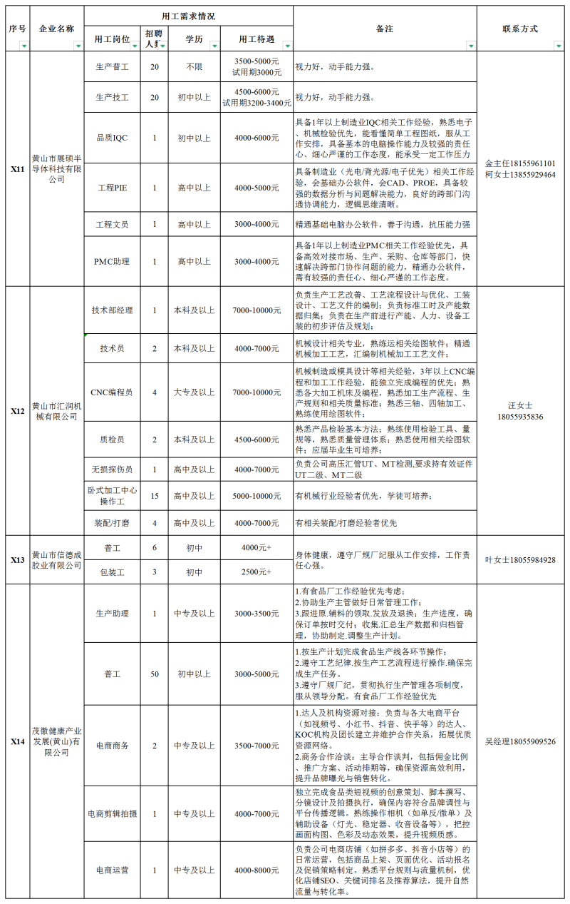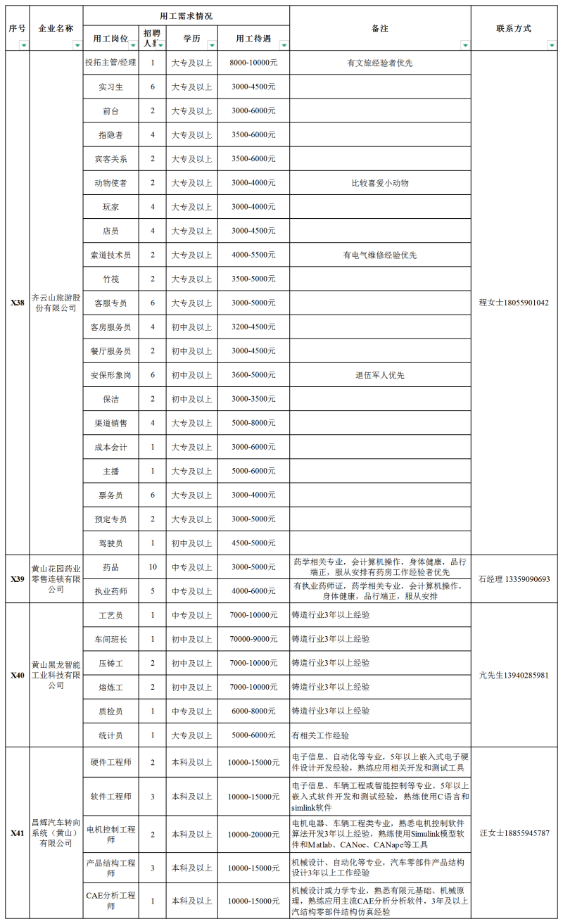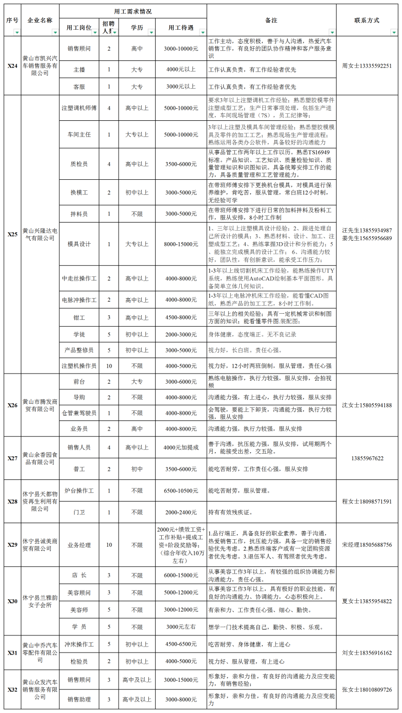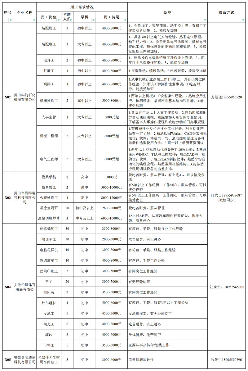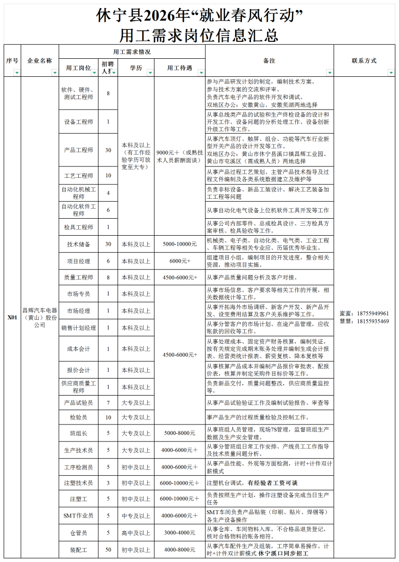 休宁县2026年“就业春风行动”用工需求岗位信息汇总