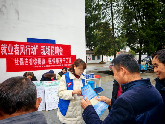 春风送暖,服务入心。春节前后,正是外出务工人员集中返乡的高峰期,也是服务民生、传递政策的黄金期。休宁县人力资源和社会保障局紧抓这一关键节点,将“就业春风行动”招聘会与社保医保政策宣传深度融合,组织“社保蓝+医保蓝”志愿服务队,分别深入海阳镇、五城镇、溪口镇、月潭湖镇、蓝田镇和渭桥乡等地,将社保医保政策与服务“打包”送到群众家门口,用暖心行动为新春佳节增添了一抹亮丽的民生底色。