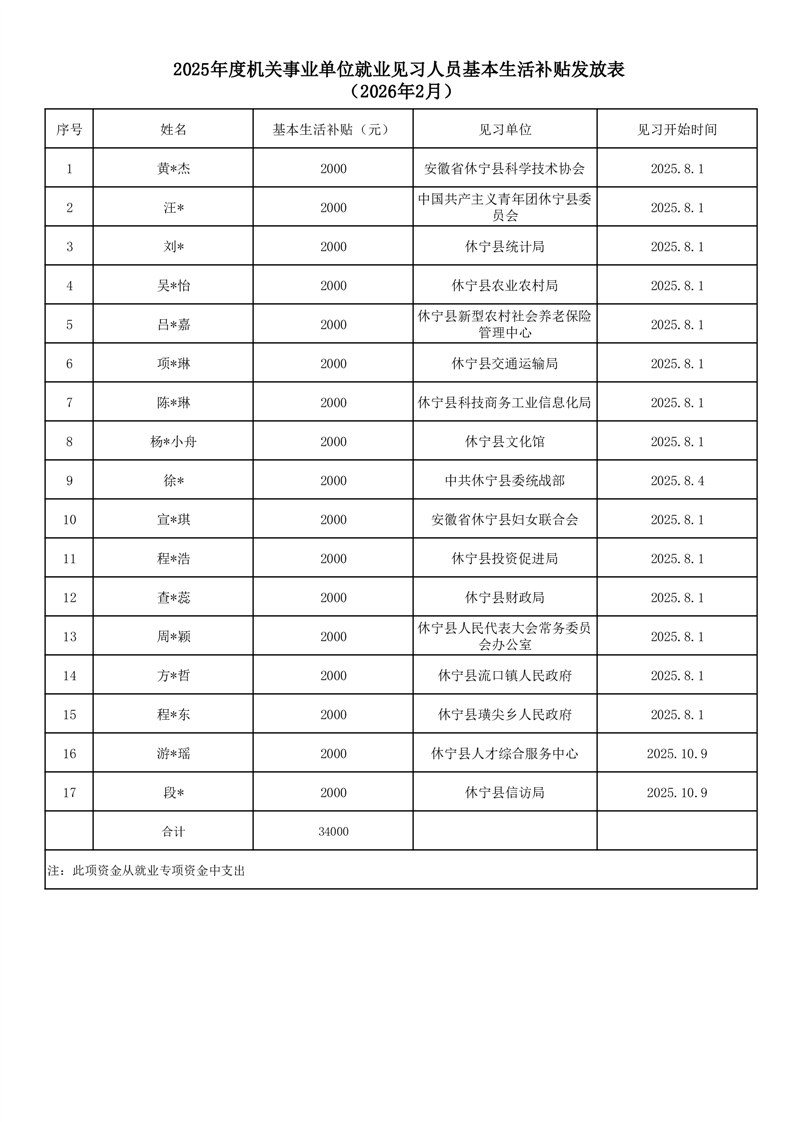 2025年度机关事业单位就业见习人员基本生活补贴发放表(2026年2月)