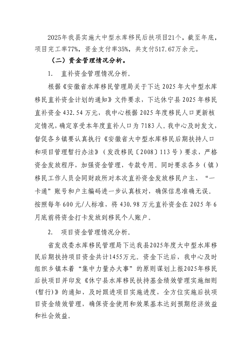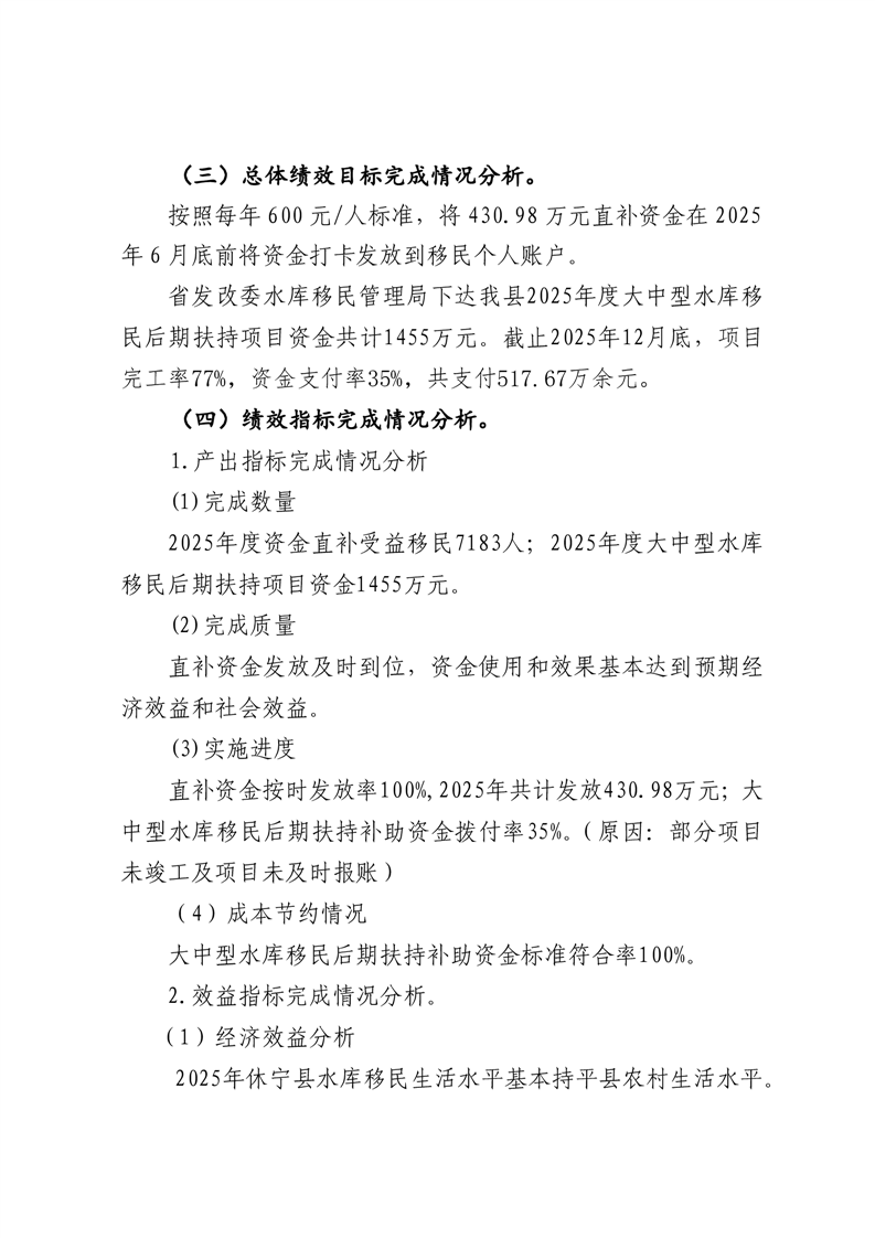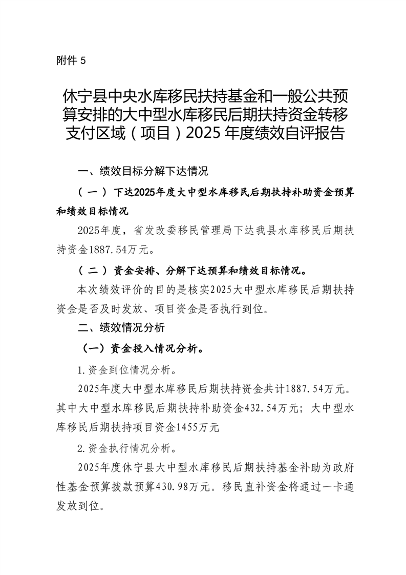 休宁县中央水库移民扶持基金和一般公共预算安排的大中型水库移民后期扶持资金转移支付区域(项目)2025 年度绩效自评报告