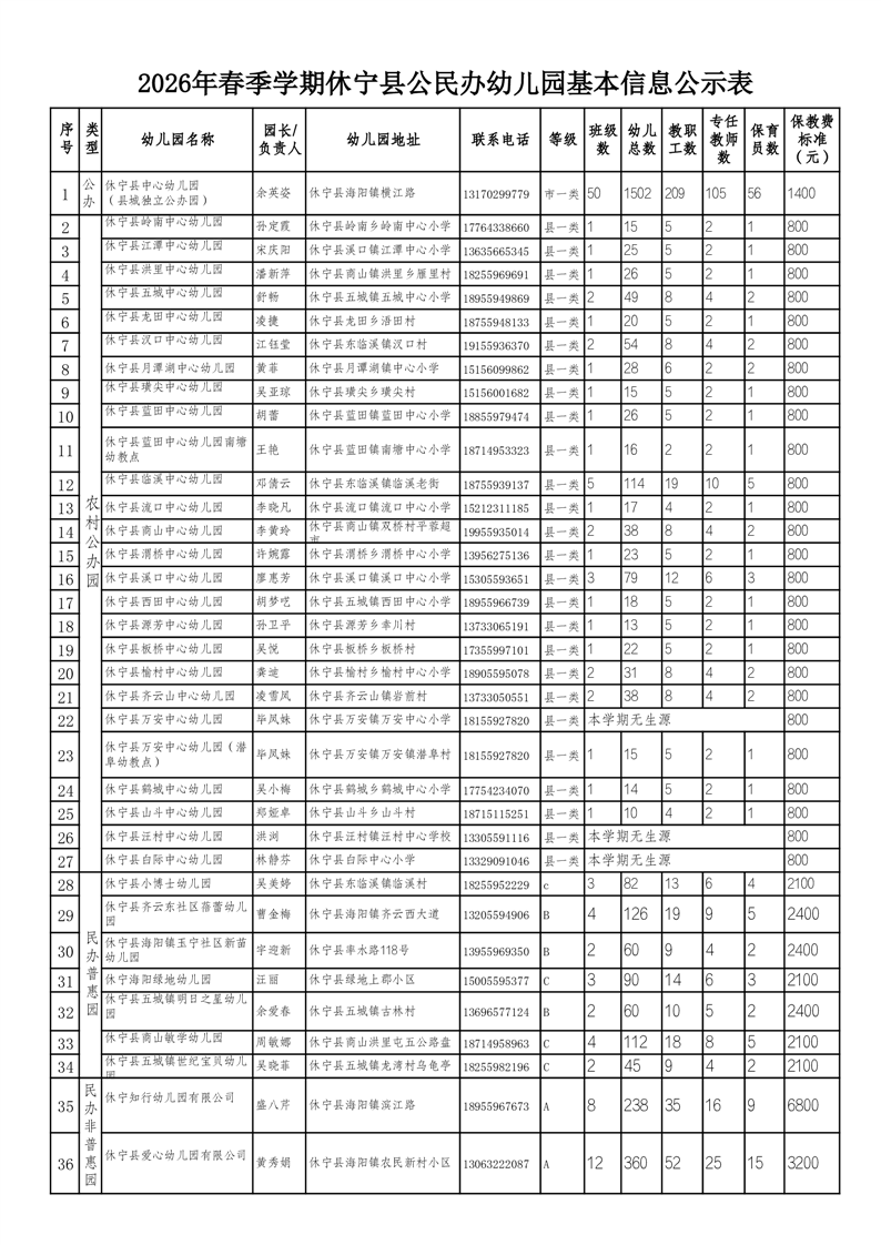 2026年春季学期休宁县公民办幼儿园基本信息公示表