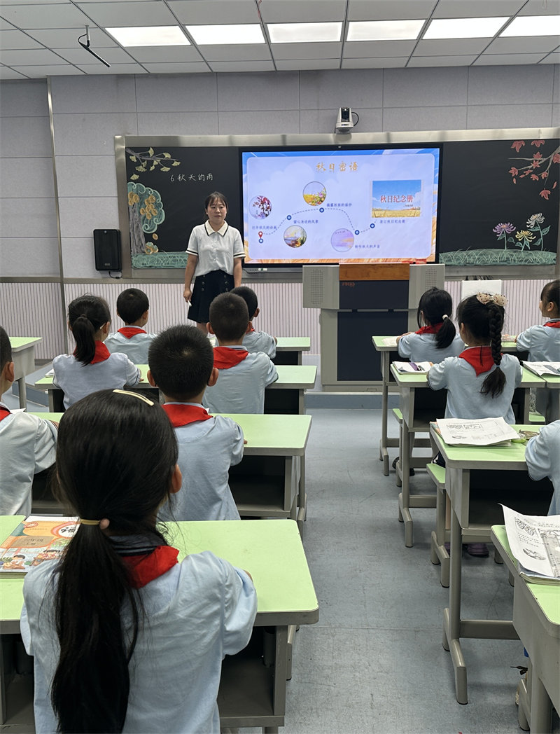 示范课程环节,叶童老师执教《秋天的雨》公开课,课程巧妙融入数智元素——通过数智化手段创设秋雨精灵、利用互动课件设计课堂问答,既生动还原了文本意境,又以技术赋能打破传统教学局限,让语文课堂更具趣味性与参与感。本堂课既是“数智赋能语文教学”的鲜活实践样本,也是省级课题《一核五径:数智赋能基地校小学语文“新课标校本精准教研”的实践研究》阶段性成果展示。课后,全体教师围绕该课例展开深度研讨,聚焦数智工具与语文教学的融合路径,碰撞出诸多实用教学思路。活动尾声,参会人员移步前操场合影留念,定格下教研协作、携手共进的珍贵瞬间。