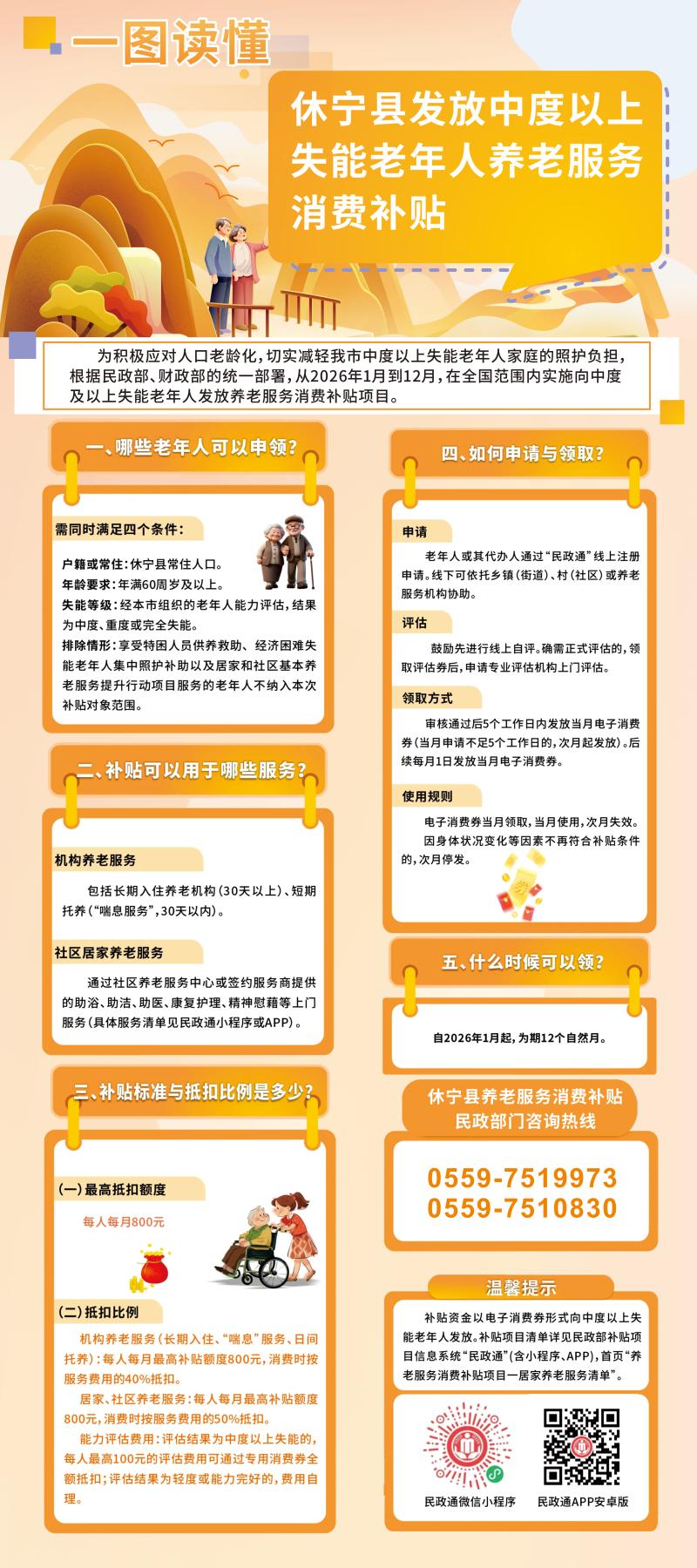 一图读懂:休宁县发放中度以上失能老年人养老服务消费补贴