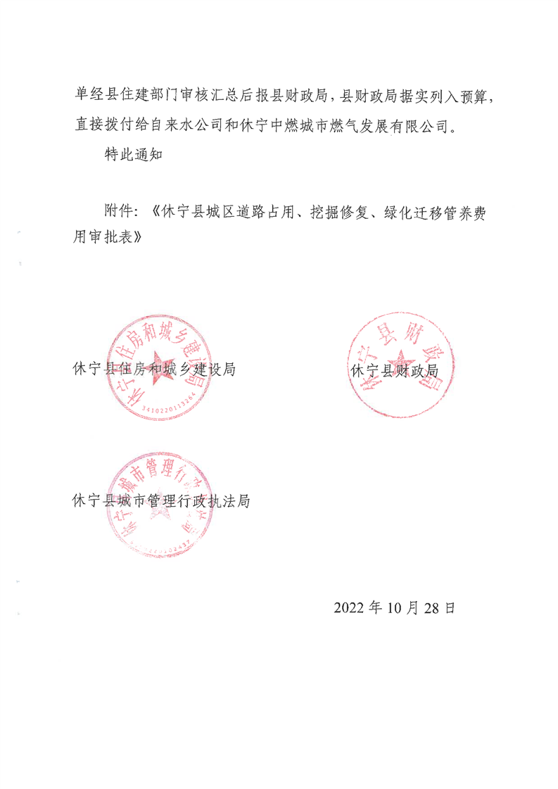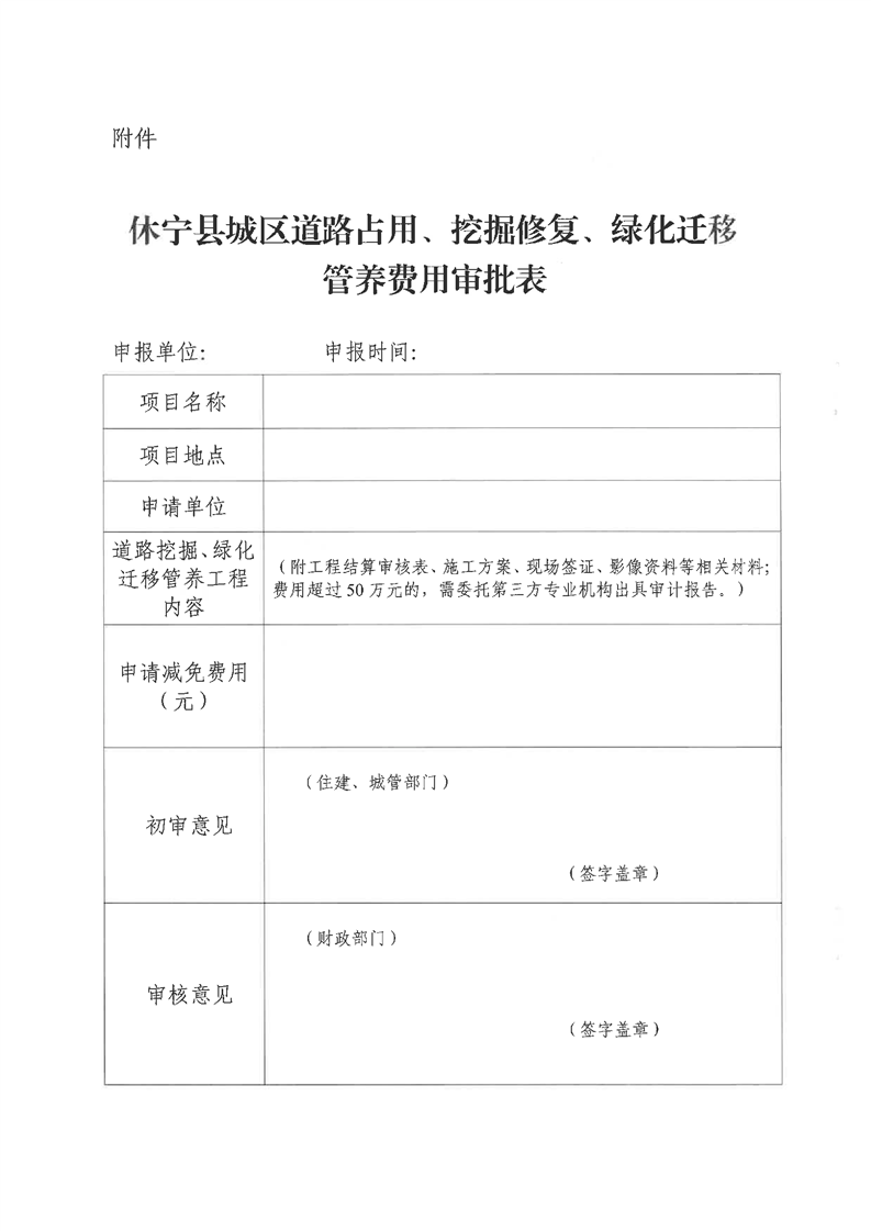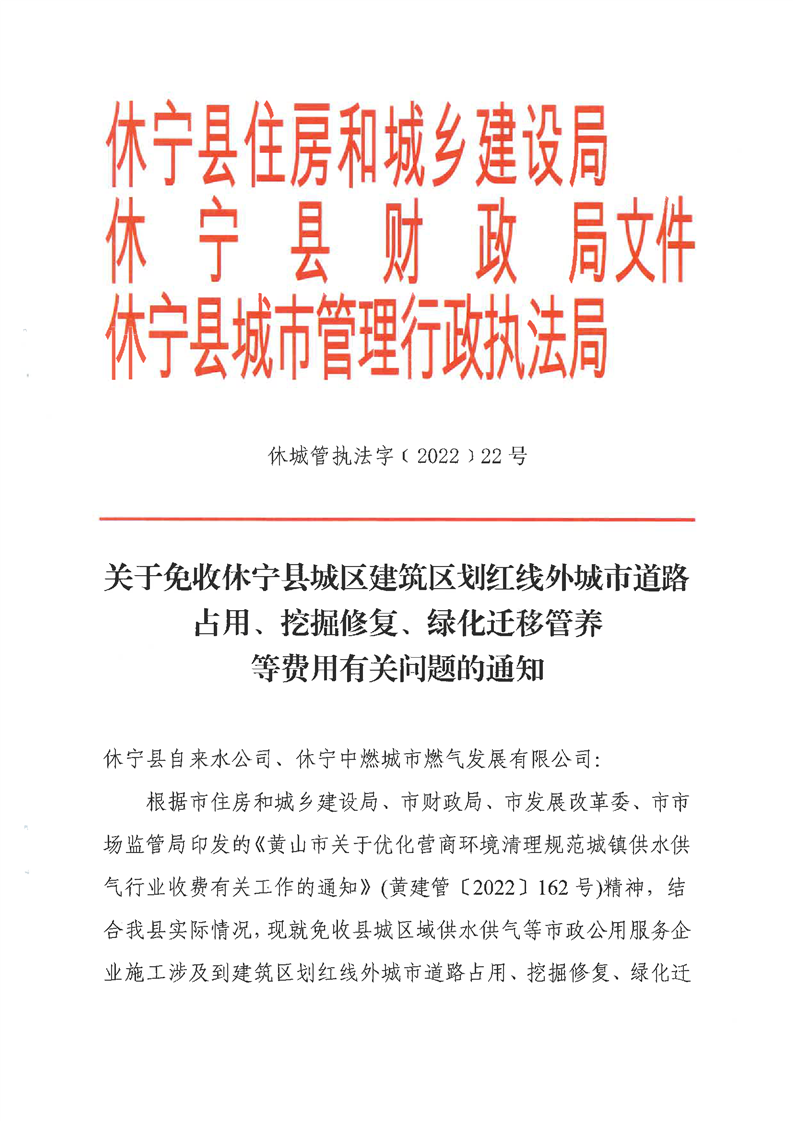 关于免收休宁县中心城区建筑区划红线外城市道路占用、挖掘修复、绿化迁移管养等费用有关问题的通知