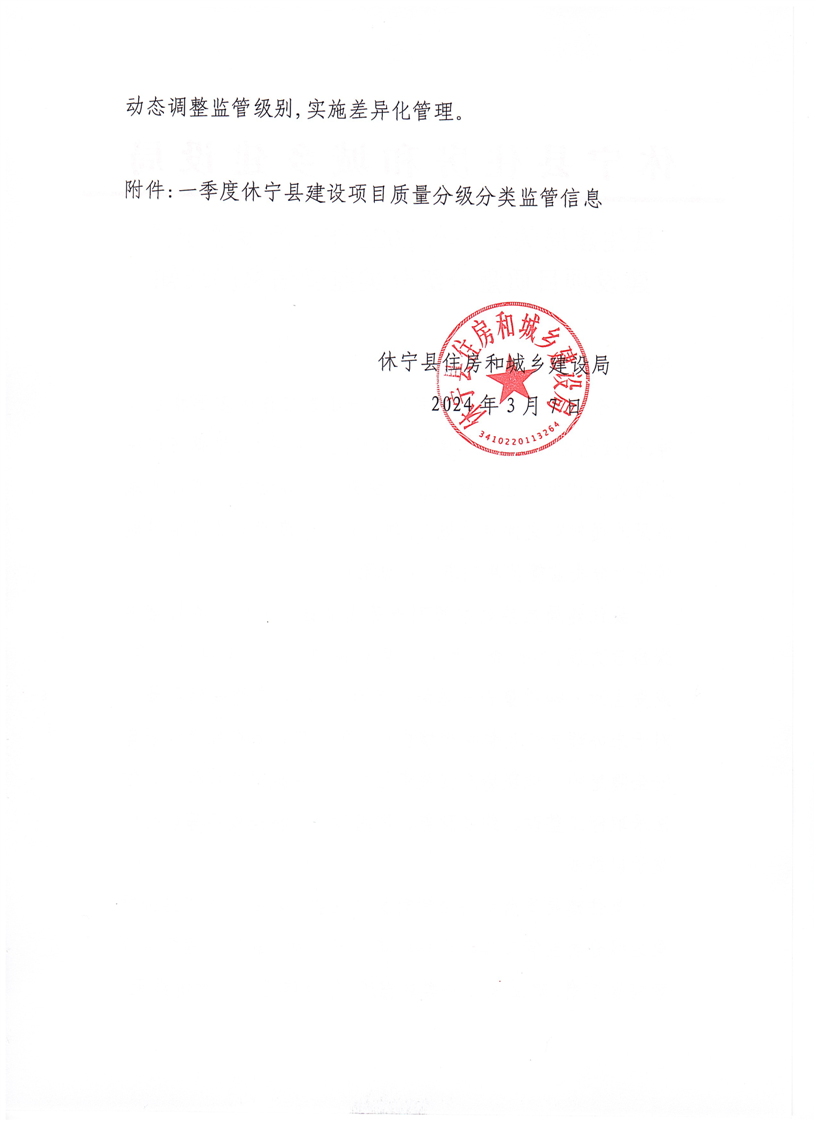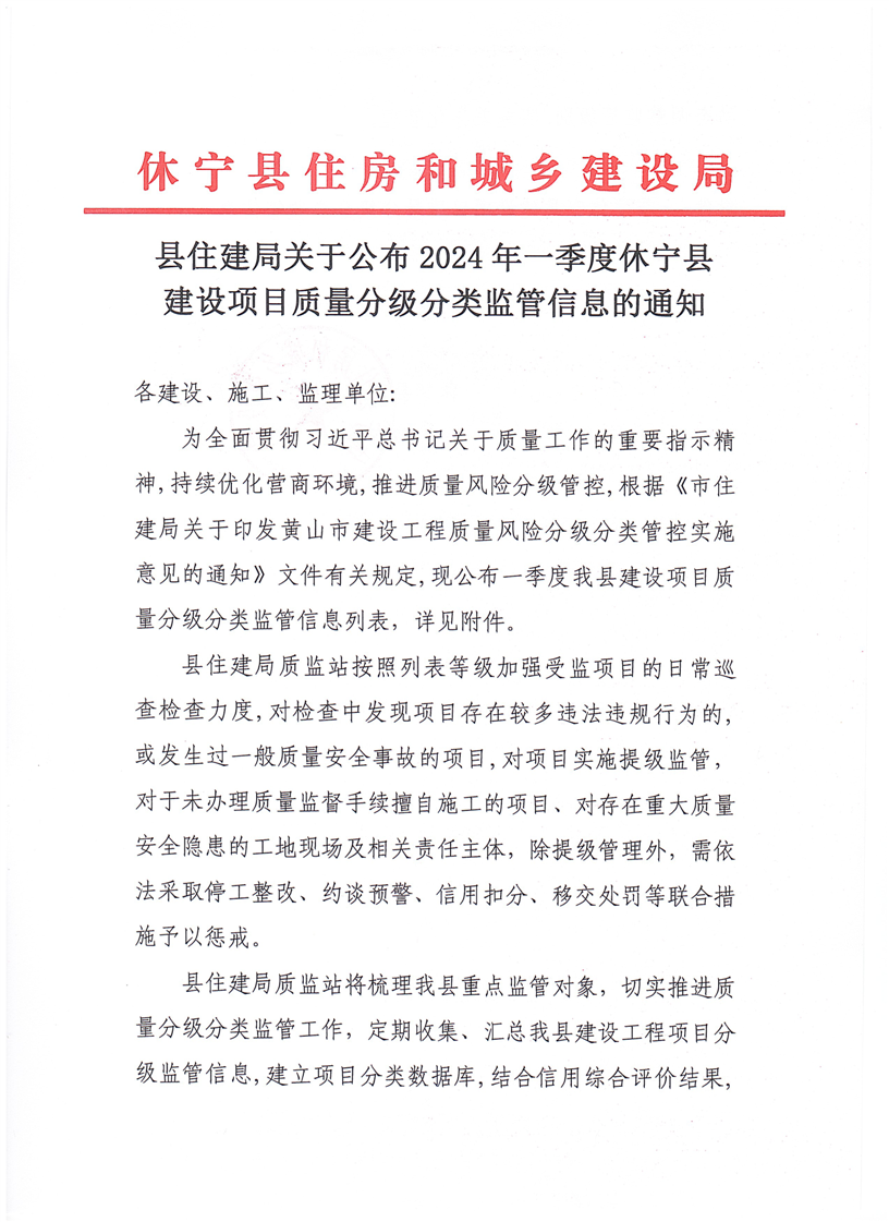 县住建局关于公布2024年一季度休宁县在建项目质量分级监管信息的通知