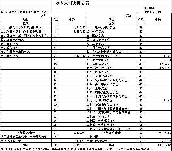 2024年度收入总计10056.64万元(含使用非财政拨款结余、年初结转和结余)、支出总计10056.64万元(含结余分配、年末结转和结余)。与2023年相比,收、支总计各减少5281.9万元,下降34.4%,主要原因:一是减少上年已完工特定目标项目支出;二是减少了2个上年列入其他运转类项目:“房地产管理中心”、“墙改中心人员经费”,本年将这2个下属单位人员直接纳入住建局人员编制预算,增加基本支出。