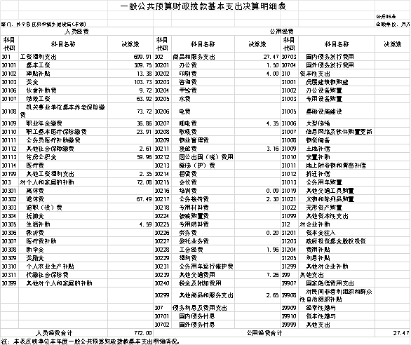 2024年度财政拨款基本支出799.47万元,其中:人员经费772万元,主要包括:基本工资、津贴补贴、奖金、伙食补助费、绩效工资、机关事业单位基本养老保险缴费、职业年金缴费、职工基本医疗保险缴费、其他社会保障缴费、住房公积金、其他工资福利支出、退休费、生活补助;公用经费27.47万元,主要包括:办公费、印刷费、邮电费、差旅费、培训费、公务接待费、劳务费、工会经费、其他交通费用、其他商品和服务支出等。