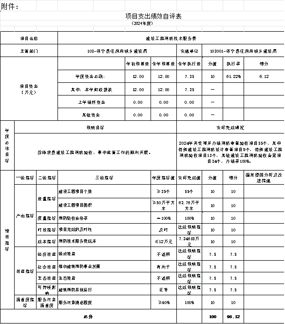 建设工程消防技术服务费项目绩效自评综述:根据年初设定的绩效目标,项目绩效自评得分为96.12分。全年预算数为12万元,执行数为7.35万元,完成预算的61.2%。项目绩效目标完成情况:2024年共受理并办结消防审查验收项目55个,其中特殊建设工程消防设计审查项目8个,特殊建设工程消防验收项目13个,其他建设工程消防验收备案项目34个,办结率100%。发现的主要问题及原因:本项目在预算编制不够精准,导致预算执行率未达到100%。下一步改进措施:应根据业务性质和实际需要,科学测算,合理编制预算,提高预算的精确性。