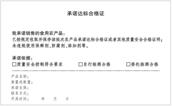 (一)承诺事项。农产品生产者承诺其生产销售的农产品未使用禁用农药、兽药及其他化合物;使用的常规农药、兽药残留不超标。从事农产品收购的单位或者个人承诺已按规定收取并保存该批次农产品承诺达标合格证或者其他质量安全合格证明;未违规使用保鲜剂、防腐剂、添加剂等。