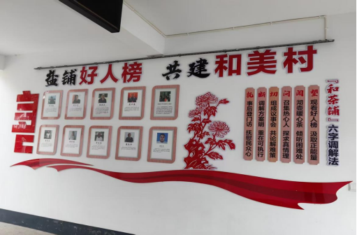 在“和茶铺”的入口处,盐铺村挖掘出“全国劳模李讨饭带领村民致富”、“和美乡村老党员带头让地捐地”等10件本村的好人事迹制成《盐铺好人榜》。每次调解前请当事人“望一望”村中凡人善举,在双方心理层面上形成“人人为我、我为人人”的崇德向善氛围。进入“和茶铺”后,调解人员为矛盾双方沏上一壶甘甜回味的菊花茶并采用“甲说乙不语,各自三分钟”的方式“听一听”双方的忧心事。随后,3-5名“热心肠”组成的“议事会”会根据矛盾双方的陈述“问一问”症结问题以探究事实真相。在充分了解事情脉络的基础上,“议事会”采取现场“切一切”的方式分析矛盾症结后通过“断一断”的方式给出明确的调解方案,以到到“双方满意、握手言和”的调解效果。最后,“议事会”还会派出一名“满意调查员”到当事人家中,以“抚一抚”的方式使群众心气更顺、心情更佳。