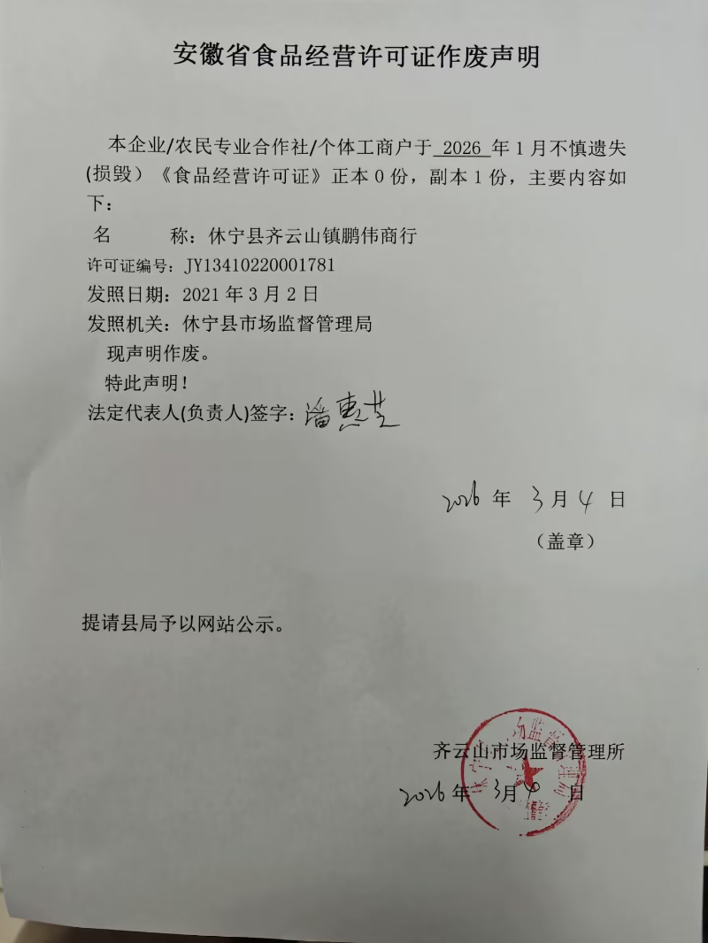 食品经营许可证作废声明(休宁县齐云山镇鹏伟商行)