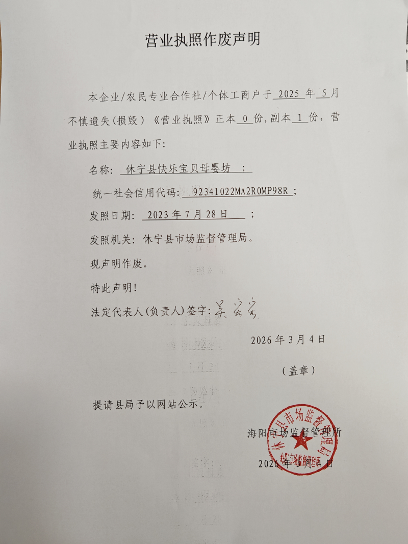 营业执照作废声明(休宁县快乐宝贝母婴坊)