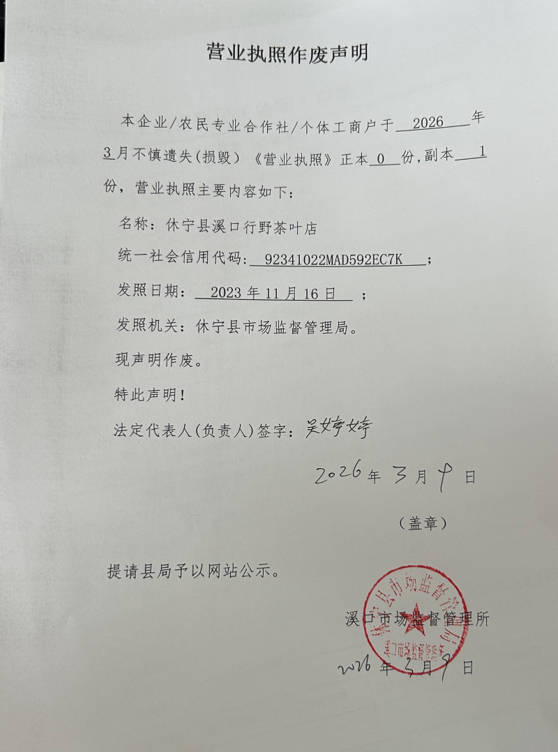 营业执照作废声明(休宁县溪口行野茶叶店)