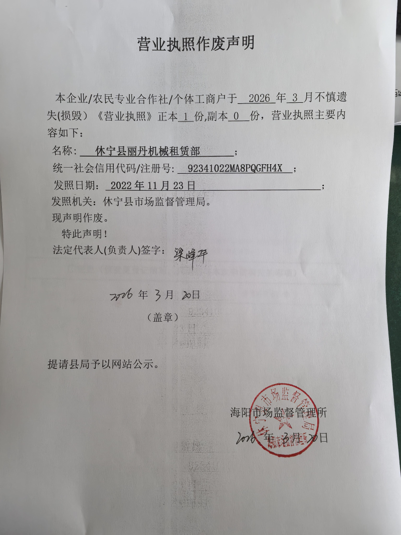 营业执照作废声明(休宁县丽丹机械租赁部)
