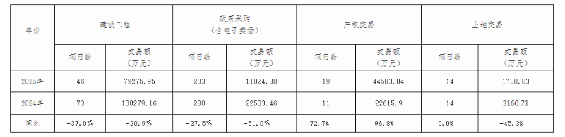 2025年1-12月份,进入平台交易项目共282个,同比下降25.4%;交易总额136533.90万元 ,同比下降8.1%,节约资金及实现资产增值20408.03万元。