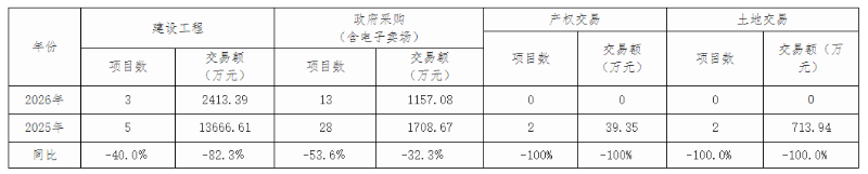 2026年1-2月份,进入平台交易项目共16个,同比下降58.8%;交易总额3570.47万元 ,同比下降77.9%,节约资金及实现资产增值441.4万元。